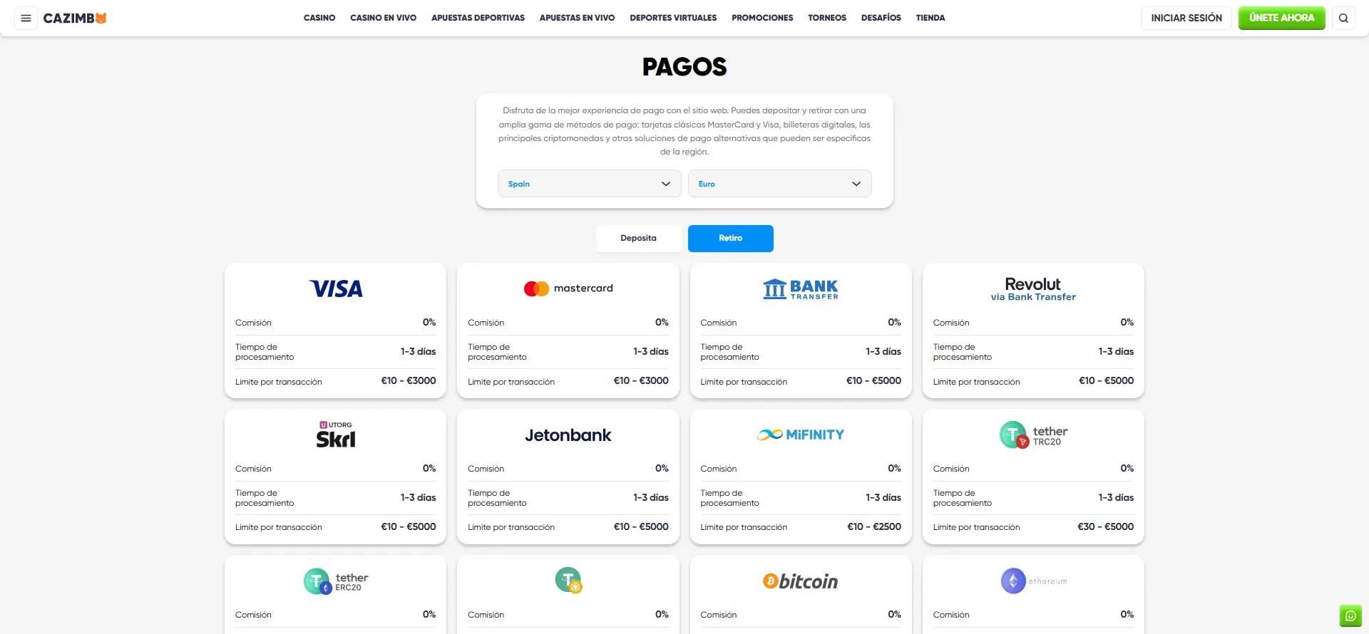 | Varios retiros rápidos | 🔥 Ventaja: Admite múltiples métodos de retiro instantáneo para satisfacer las necesidades de cada jugador | Cazimbo |