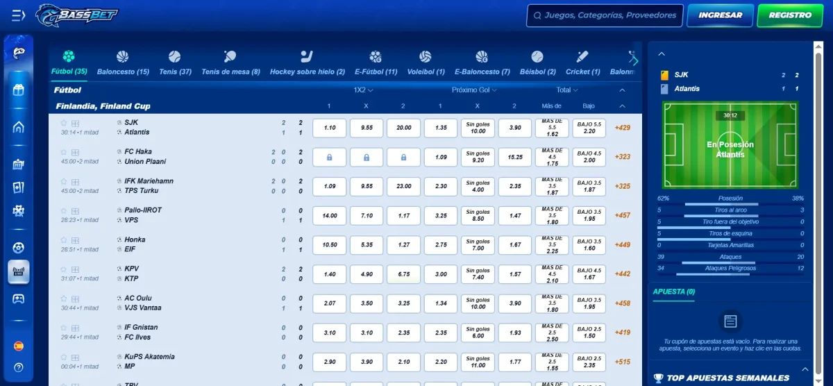 - Bassbet: sorprende con cuotas especialmente altas en ligas alternativas y deportes menos tradicionales. Si te gusta explorar mercados diferentes y cazar oportunidades, Bassbet puede darte ventaja frente a otros operadores.