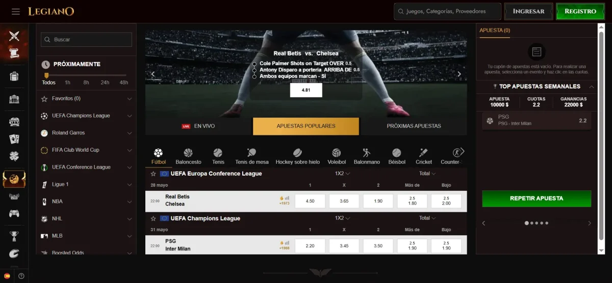 - Legiano: combina cuotas competitivas con un entorno gráfico intuitivo. Su sección de apuestas en directo incluye estadísticas en tiempo real, lo que permite tomar decisiones rápidas y con mayor información.