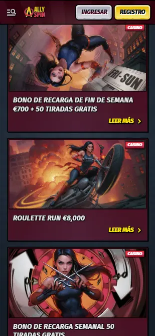 El sitio web del AllySpin Casino está bien organizado, con una distribución intuitiva de las secciones y una navegación clara. El diseño del sitio es un regalo para los amantes de los cómics. Los colores clásicos rojo, negro y amarillo, por un lado, rinden homenaje a los colores tradicionales de los casinos, pero también son una reverencia visual a las novelas gráficas al estilo de Stan Lee.