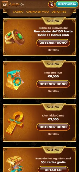 En cuanto a la biblioteca de juegos, AmunRa contaba, al momento de redactar esta reseña, con más de 5000 títulos de los mejores desarrolladores de contenido de juegos. La colección está bien equilibrada, aunque se centra principalmente en diversas variantes de tragamonedas. Los juegos clásicos, por su parte, están principalmente en la sección de casino en vivo. Además, cuenta con un excelente programa de bonos, un sistema emocionante de acumulación de monedas de bonificación en torneos y competiciones, y, por supuesto, grandes opciones para apuestas deportivas.