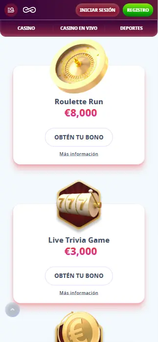 El programa de bonos de Casino Infinity es uno de los más completos y bien diseñados entre las nuevas plataformas en línea. Hay ofertas tanto para amantes del casino como para aficionados a las apuestas deportivas. La sección de promociones está organizada por categorías: “Casino”, “Deportes”, ofertas especiales (torneos, programa VIP, tienda de bonos, etc.).
