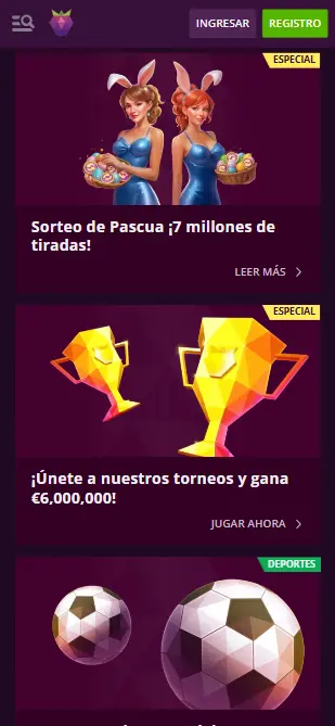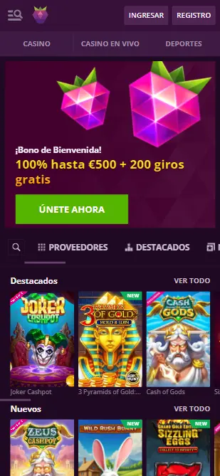 El diseño de su plataforma combina un estilo contemporáneo con una paleta de colores equilibrada, predominando tonos morados y negros, acompañados de ilustraciones vectoriales que representan bayas estilizadas. El emblema principal del casino, una frambuesa de formas geométricas peculiares, capta la atención de inmediato. Por su parte, los íconos, textos y elementos visuales mantienen un enfoque minimalista, logrando una excelente legibilidad sobre el fondo oscuro.