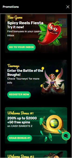 Los jugadores más activos son recompensados con un programa de lealtad que ofrece cashback escalonado (del 25% al 50%, según tu nivel) y acceso a promociones exclusivas. Además, el casino envía ofertas personalizadas a tu bandeja de mensajes en el sitio, cerca del menú y el cajero, incluyendo códigos especiales que podrían darte desde giros gratis hasta bonos sin depósito.