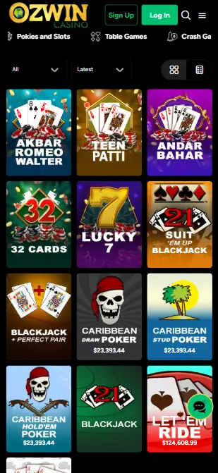 La selección de juegos de mesa en Ozwin Casino es más limitada, pero cubre los clásicos que todo jugador disfruta. Aquí encontrarás opciones como blackjack, baccarat, Texas Hold’em, póker de tres cartas y hasta juegos menos comunes como Andar Bahar y Lucky 7. Aunque no hay una gran variedad, la calidad de RTG asegura una experiencia sólida, especialmente si prefieres usar estrategia para desafiar a la casa.
