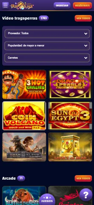 Las tragamonedas son el punto fuerte del casino Play Regal. Aquí se presentan más de 2000 opciones de entretenimiento, que para la comodidad de los jugadores están divididas en secciones convenientes.