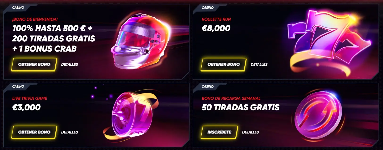 El bono de bienvenida también incluye un cangrejo bonus, con el que puedes obtener bonos adicionales excelentes. La cantidad mínima de depósito para ambas ofertas es de €20.