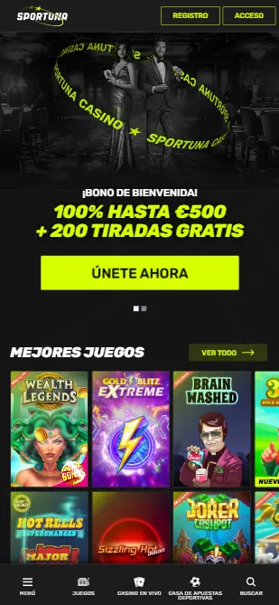 Sportuna Casino ofrece un atractivo paquete de bienvenida: al registrarte, tu primer depósito de al menos 20 euros recibe un bono del 100% hasta 500 euros y 200 giros gratis. Los giros se entregan en tandas de 20 diarios durante 10 días (cada tanda válida por 24 horas), con un requisito de apuesta de 35x para el bono y 40x para las ganancias de los giros.