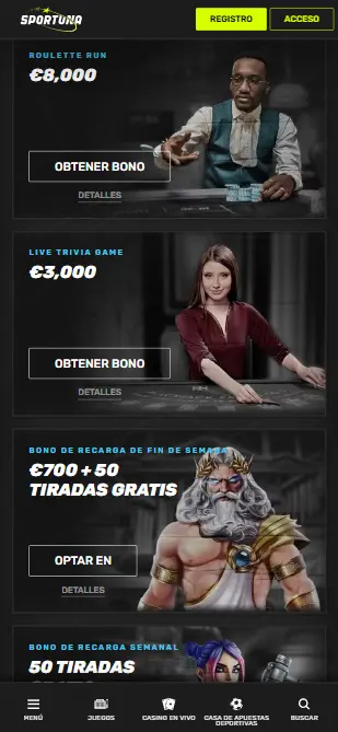 Aunque su nombre podría sugerir un enfoque exclusivo en apuestas deportivas, Sportuna Casino sorprende con una amplia oferta de juegos. Cuenta con 84 proveedores, como Play’n GO, NetEnt y Microgaming, que alimentan una diversa biblioteca de slots para todos los gustos. Además, destaca en el casino en vivo con Evolution Gaming, ofreciendo mesas de alta calidad con clásicos como ruleta, blackjack y baccarat, además de opciones innovadoras, creando una experiencia completa y variada.