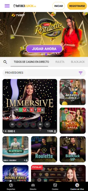 La sección de casino en vivo es bastante diversa, aunque si juzgamos por la popularidad de los juegos, las diferentes variaciones de la ruleta ocupan el primer lugar en WikiLuck. Al momento de escribir esta reseña, había más de 120 juegos diferentes de los principales proveedores como Evolution Gaming, Pragmatic Live, Ezugi y Bombay, todos disponibles en español, lo que sin duda gustará a los jugadores de España y América Latina.