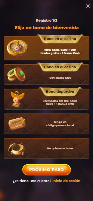 Empezando por el bono de bienvenida: 100% hasta 500 euros + 200 giros gratis y 1 cangrejo de bonificación con un depósito mínimo de 20 euros. Los requisitos de apuesta son de 35x para “bono + depósito”. Si deseas retirar las ganancias obtenidas con los giros gratis, los requisitos de apuesta aumentan a 40x. Tienes 10 días para cumplir con todas las condiciones.